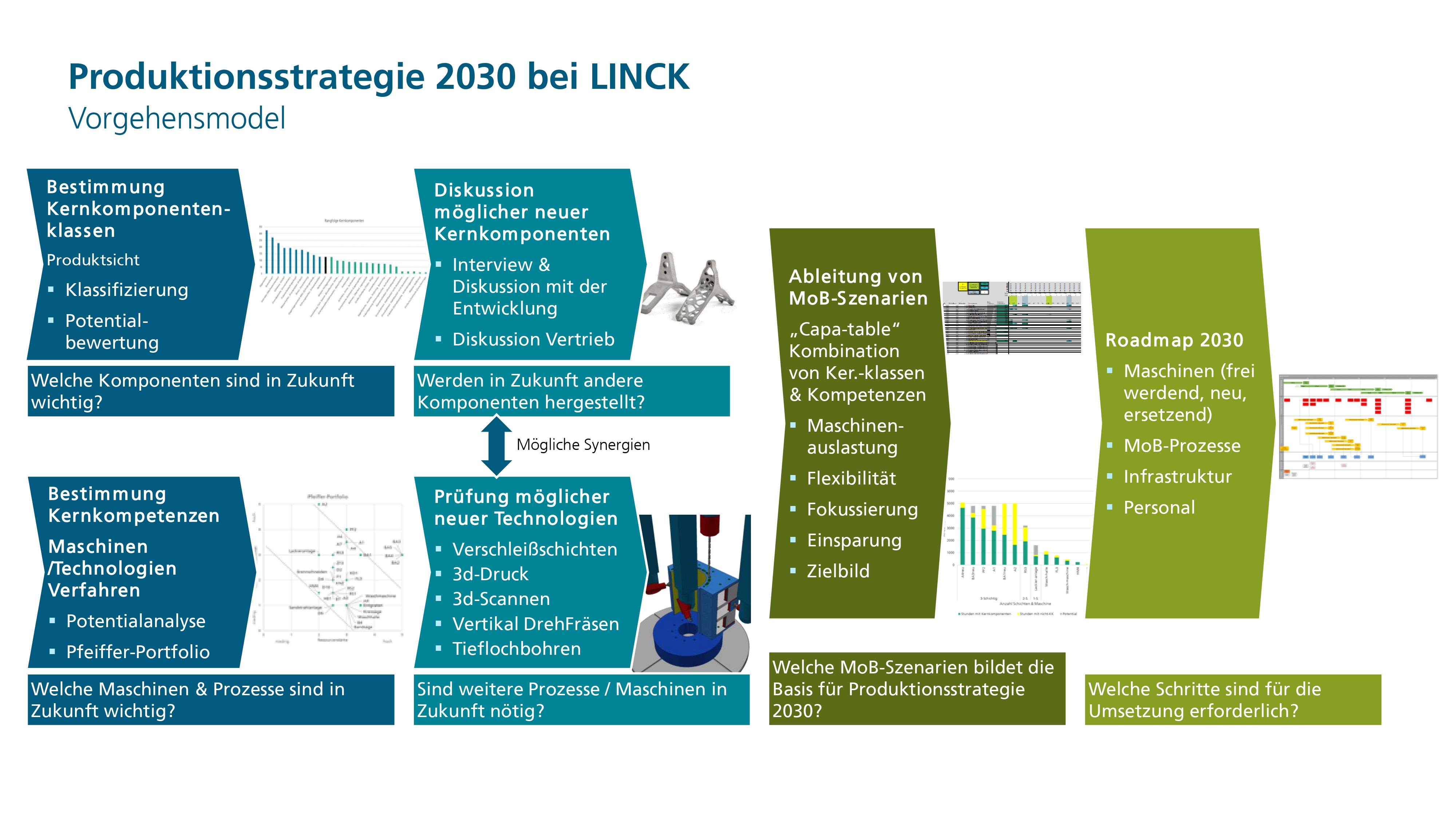Strategisches Ziel von LINCK ist es, »unschlagbar bei kleinen Losgrößen« zu sein und die hohe Fertigungskomplexität auch in Zukunft wirtschaftlich am Standort abbilden zu können. Dazu möchte LINCK die aktuelle Produktionsstrategie systematisch überprüfen und ein zukunftsfähiges, abgestimmtes Gesamtbild für operative und technische Exzellenz entwickeln.