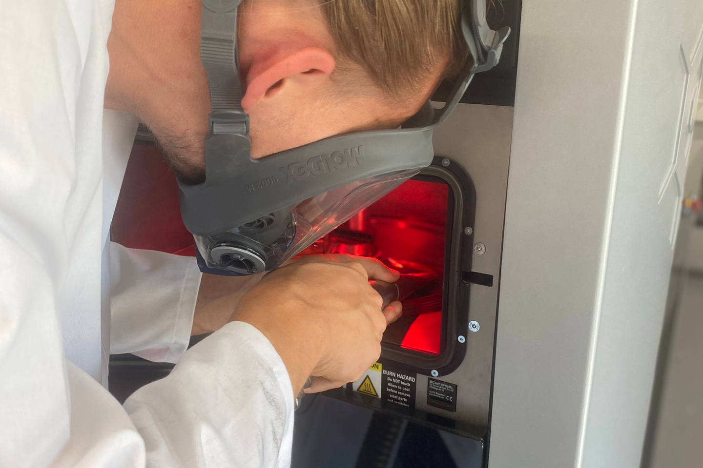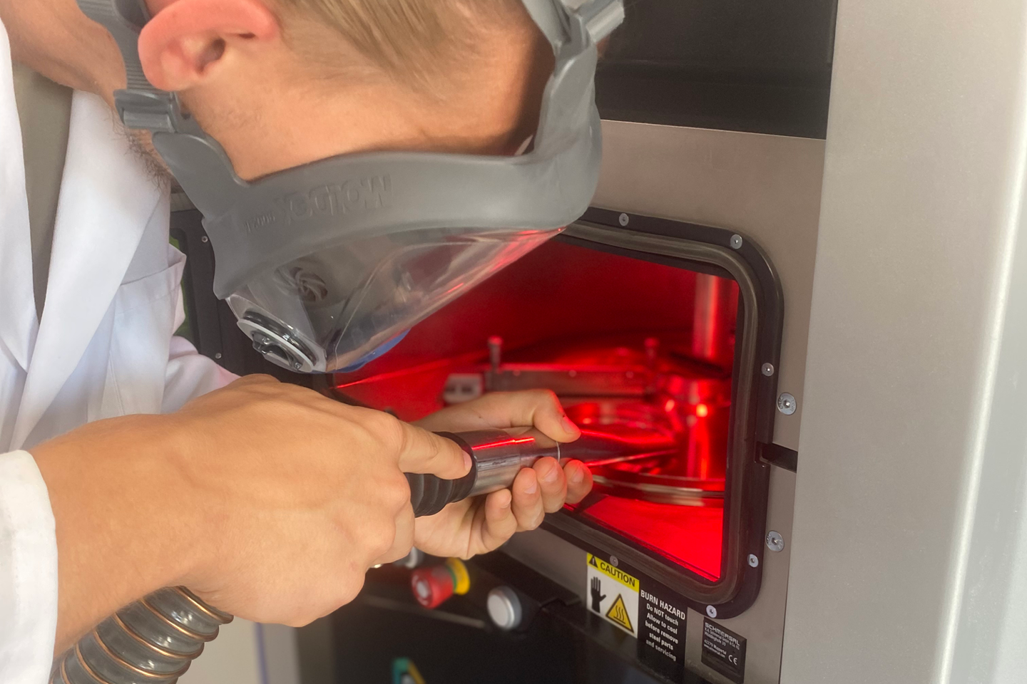 Beim additiven Fertigungsverfahren Laserstrahlschmelzen können hochkomplexe Bauteile schichtweise gefertigt werden. Nach dem Fertigungsprozess muss das überschüssige Pulver aus dem Bauraum und von den Bauteilen entfernt werden.